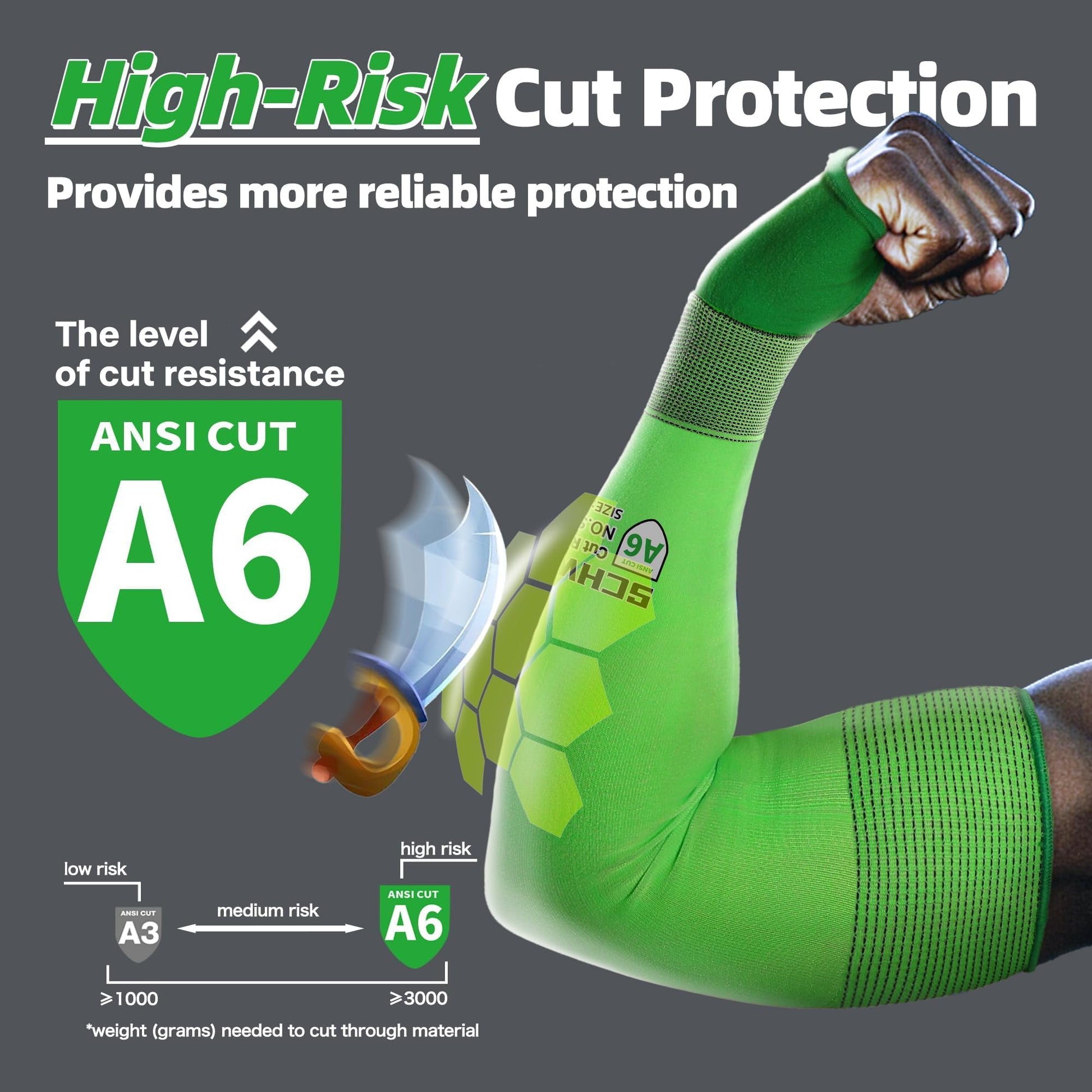 - Protección contra cortes de alto riesgo: Nuestras fundas resistentes a cortes A6 ofrecen una protección superior, soportando más de 3000 gramos de carga de corte, más del triple de la resistencia de las fundas A3 comunes. Estas fundas están diseñadas específicamente para situaciones de alto riesgo, lo que garantiza una protección robusta contra cortes graves.
