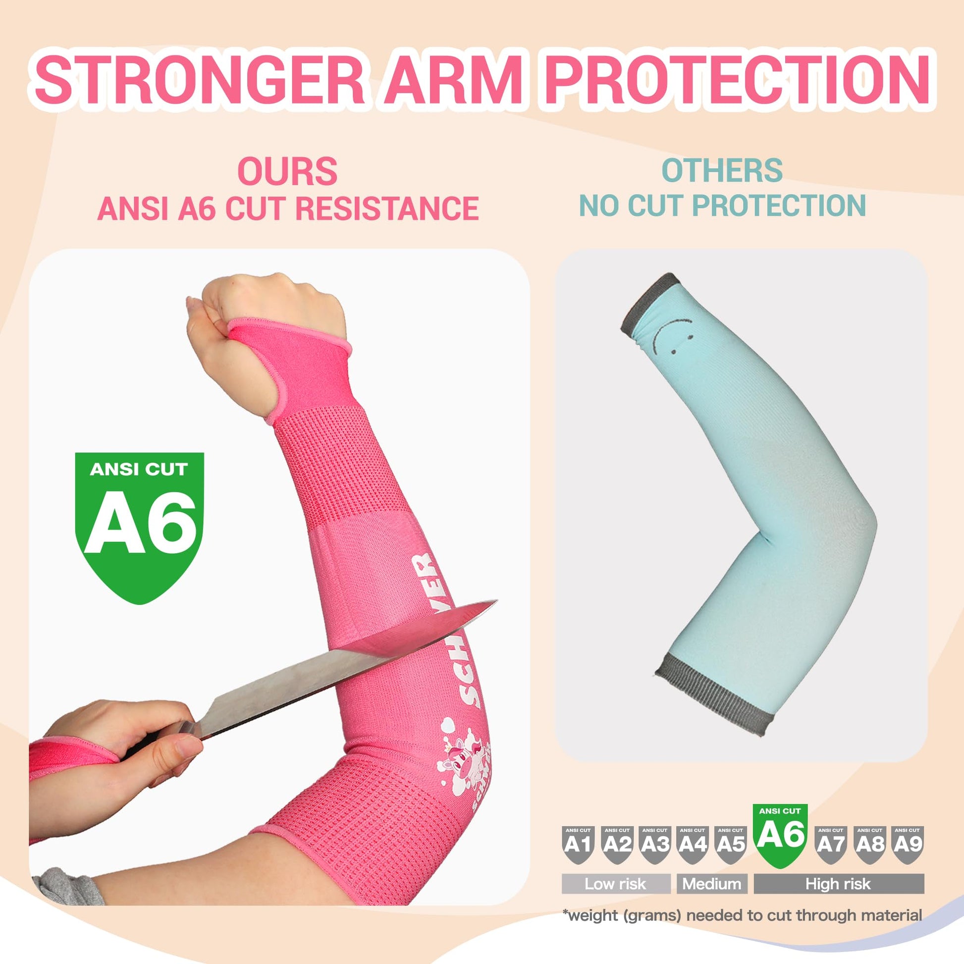 - Protección contra cortes de alto riesgo para niños: Nuestras mangas resistentes a cortes ofrecen una protección superior contra cortes, diseñadas con tecnología A6. En comparación con los protectores de brazos convencionales, estas mangas para jóvenes previenen eficazmente raspaduras, caídas y otras lesiones que ocurren mientras tu hijo juega, garantizando así su seguridad.
